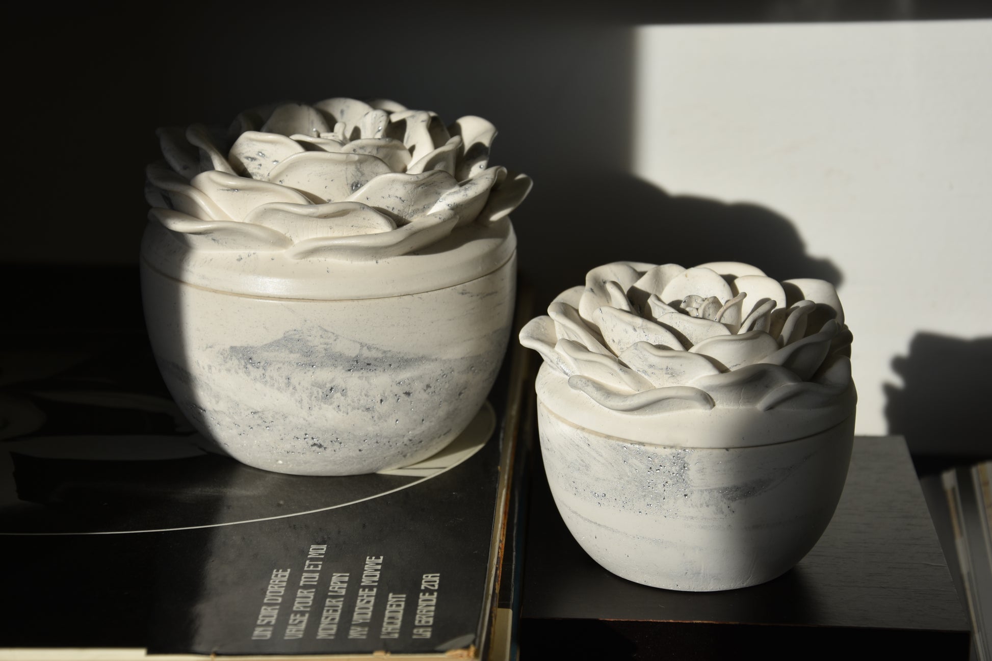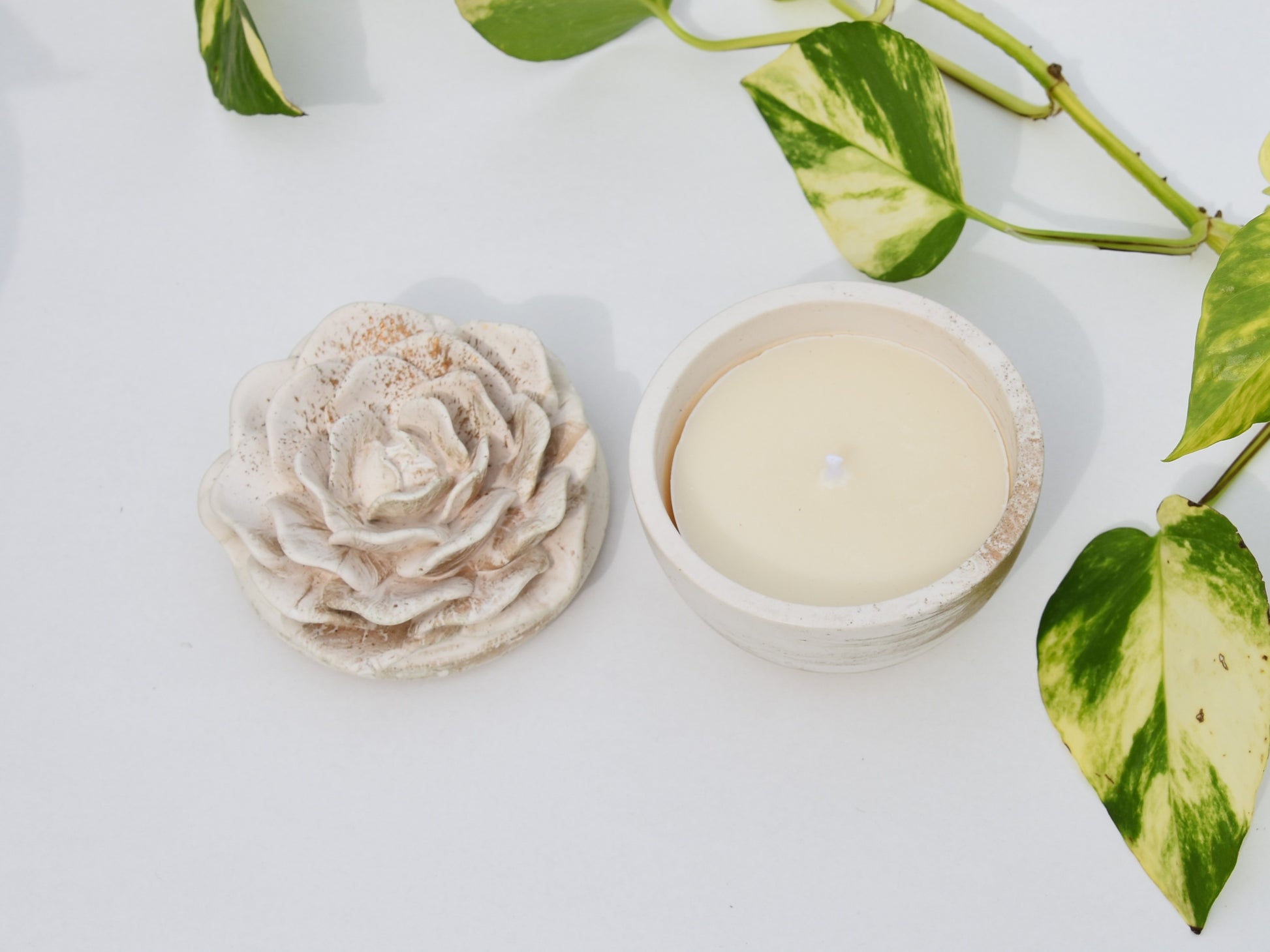 Questa candela artigianale in un contenitore di gesso con coperchio a forma di rosa non è solo una fonte di luce e atmosfera, ma anche un elegante elemento decorativo per la tua casa.